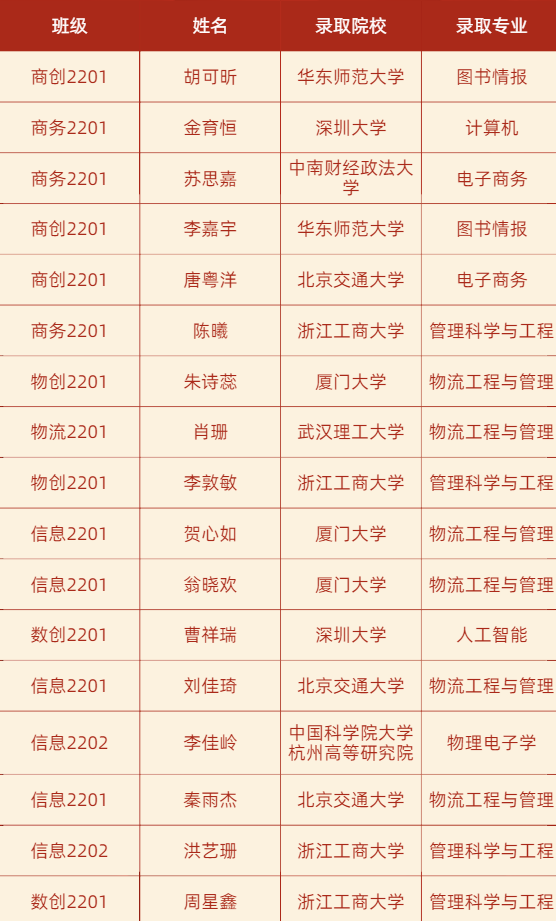 热烈祝贺:浙江工商大学管理工程与电子商务学院(管工学院)2022级推荐免试攻读硕士学位研究生工作圆满结束,我院学子凭借优异的成绩和出色的综合素质,在推免录取中大放异彩,成功被厦门大学、华东师范大学等多所国内知名高校录取!