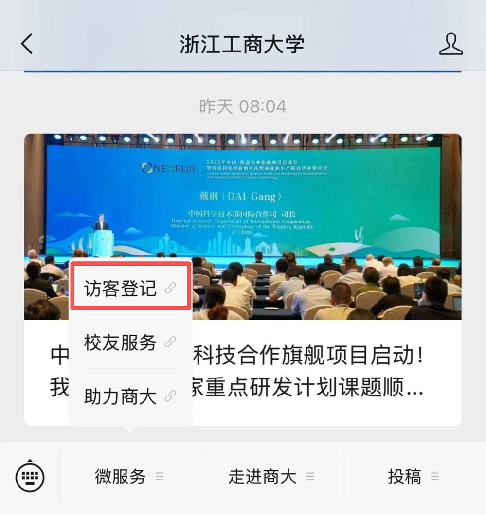 校外人员进校请关注“浙江工商大学”微信公众号,底部“微服务”进行访客登记。