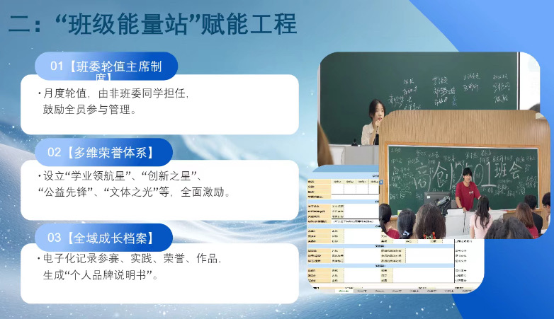 创新推行班委轮值主席制度,设立多维荣誉体系与全域成长档案,激发全员参与管理,记录个人成长轨迹。