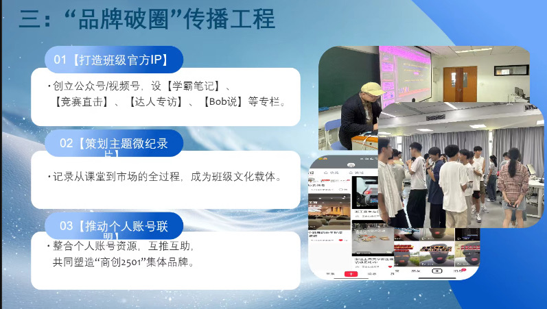 打造班级官方IP,开设“学霸笔记”“Bob说”等专栏,策划微纪录片,整合个人账号资源,共同传播“商创2501”品牌故事。