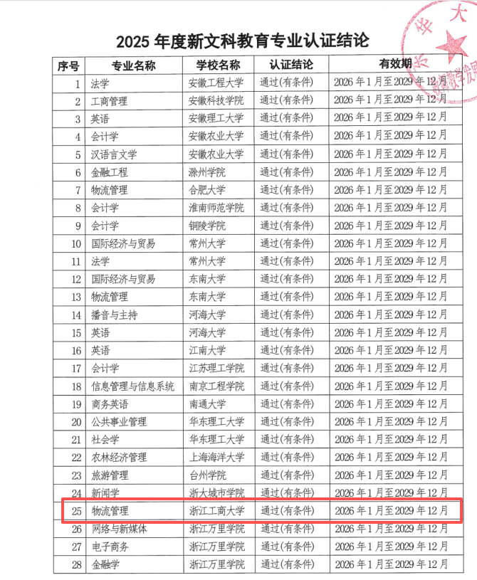 近日,长三角新文科教育专业认证联盟发布了《关于公布2025年度新文科教育专业认证结论的通知》,我院物流管理专业通过认证,认证结论有效期为4年,即2026年1月至2029年12月,该专业系我校首个通过此项认证的专业。
